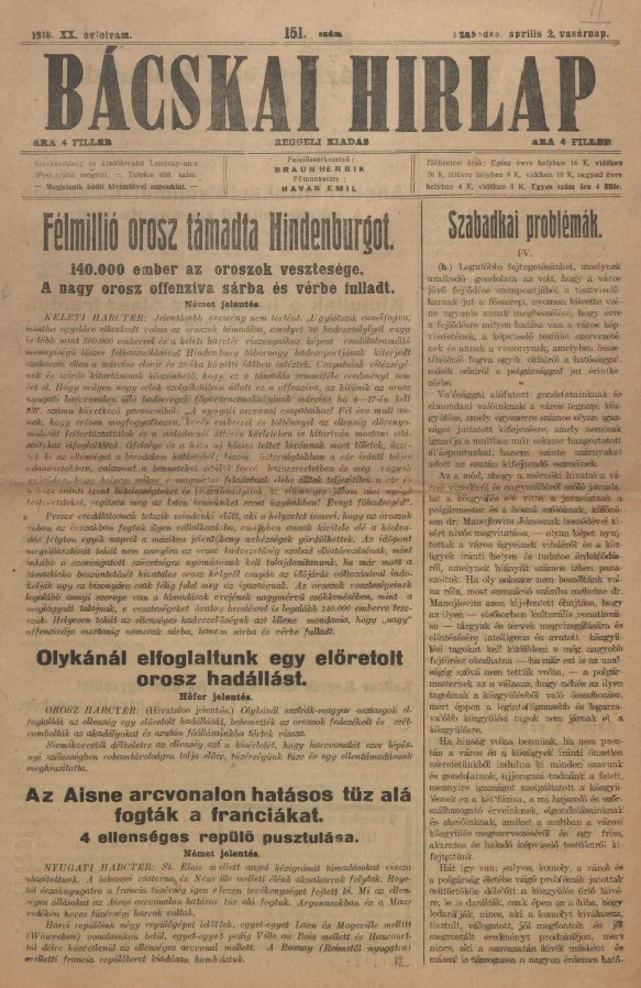 Bácskai Hirlap, 20. évf. 1916. április 2. 151. sz.
