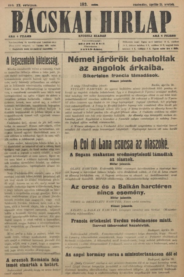 Bácskai Hirlap, 20. évf. 1916. április 21. 183. sz.