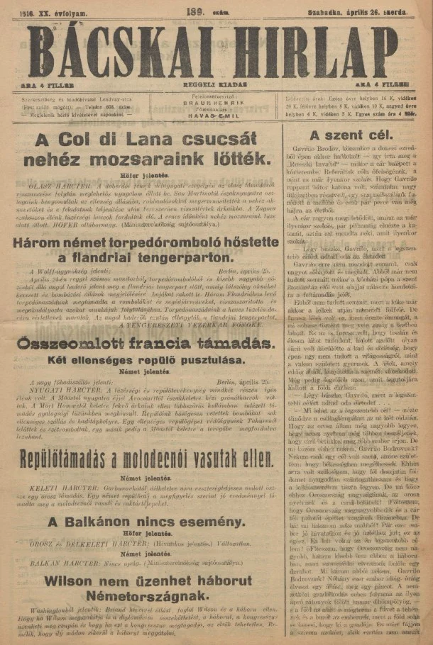 Bácskai Hirlap, 20. évf. 1916. április 26. 189. sz.