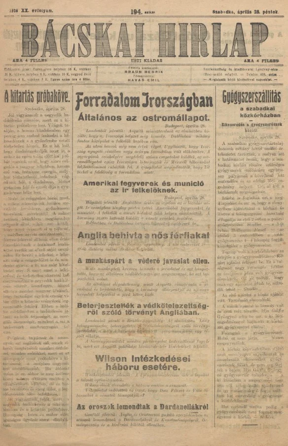 Bácskai Hirlap, 20. évf. 1916. április 28. 194. sz.