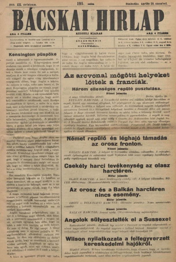 Bácskai Hirlap, 20. évf. 1916. április 29. 195. sz.