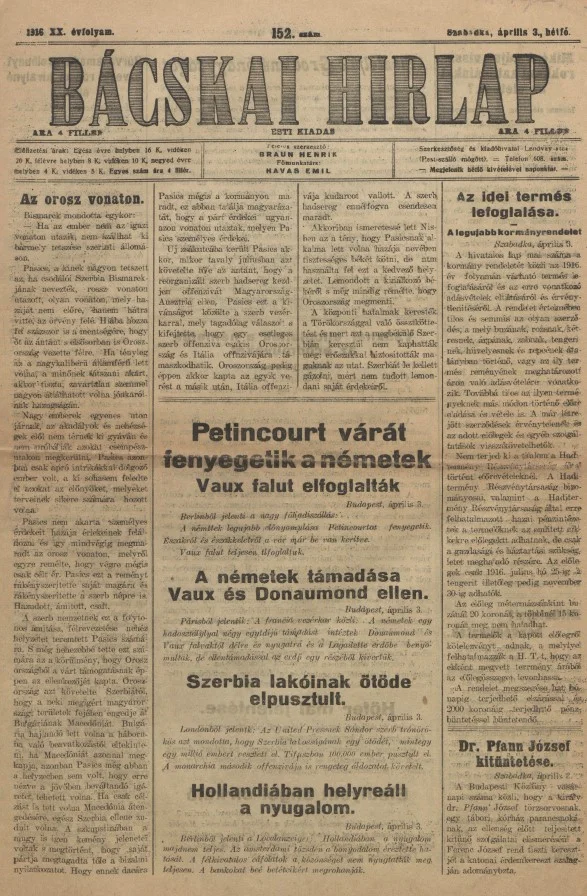 Bácskai Hirlap, 20. évf. 1916. április 3. 152. sz.