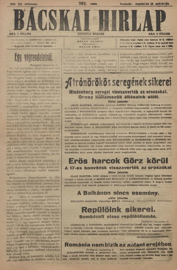 Bácskai Hirlap, 20. évf. 1916. augusztus 10. 363. sz.