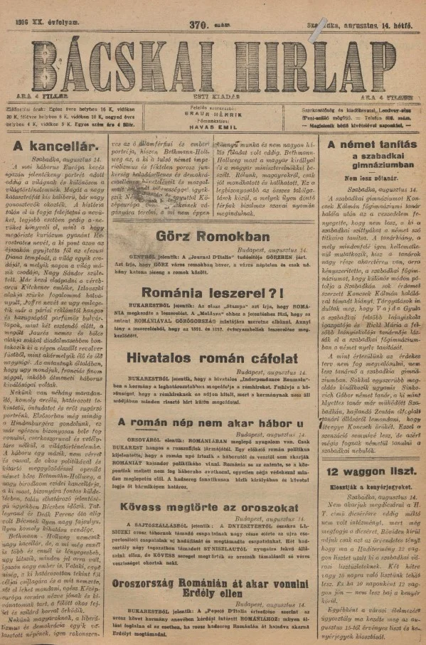 Bácskai Hirlap, 20. évf. 1916. augusztus 14. 370. sz.