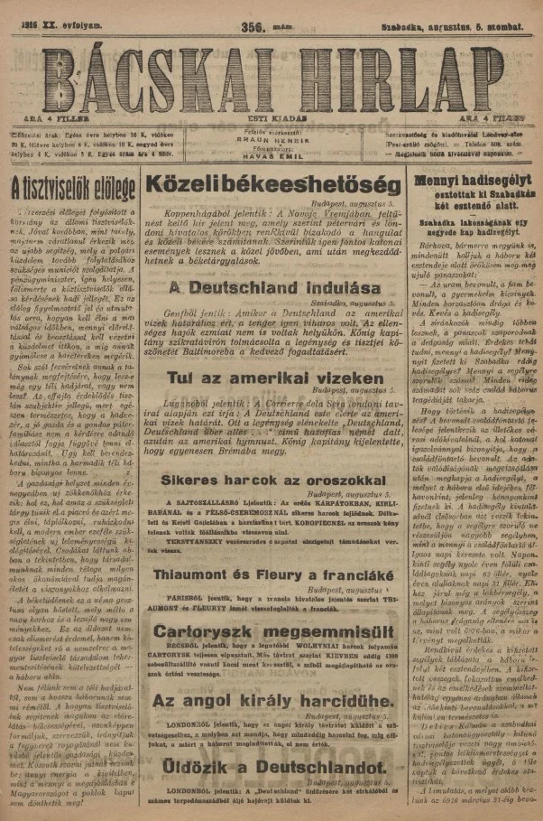 Bácskai Hirlap, 20. évf. 1916. augusztus 5. 356. sz.