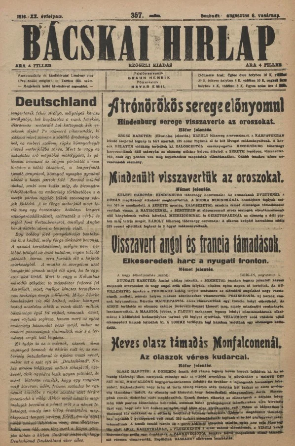 Bácskai Hirlap, 20. évf. 1916. augusztus 6. 357. sz.
