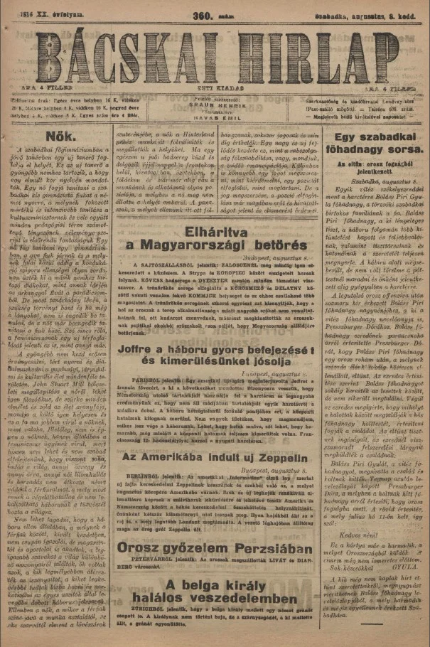 Bácskai Hirlap, 20. évf. 1916. augusztus 8. 360. sz.