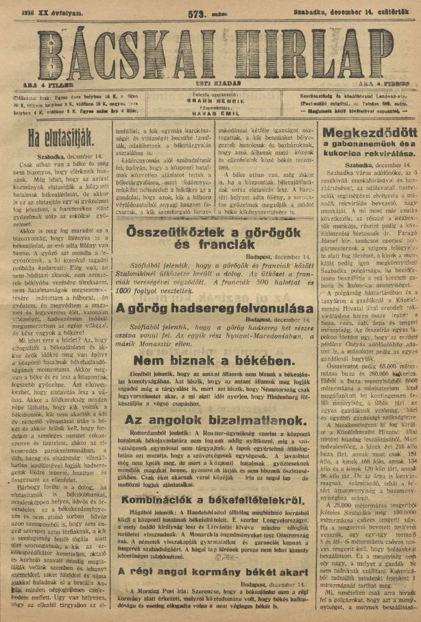 Bácskai Hirlap, 20. évf. 1916. december 14. 573. sz.