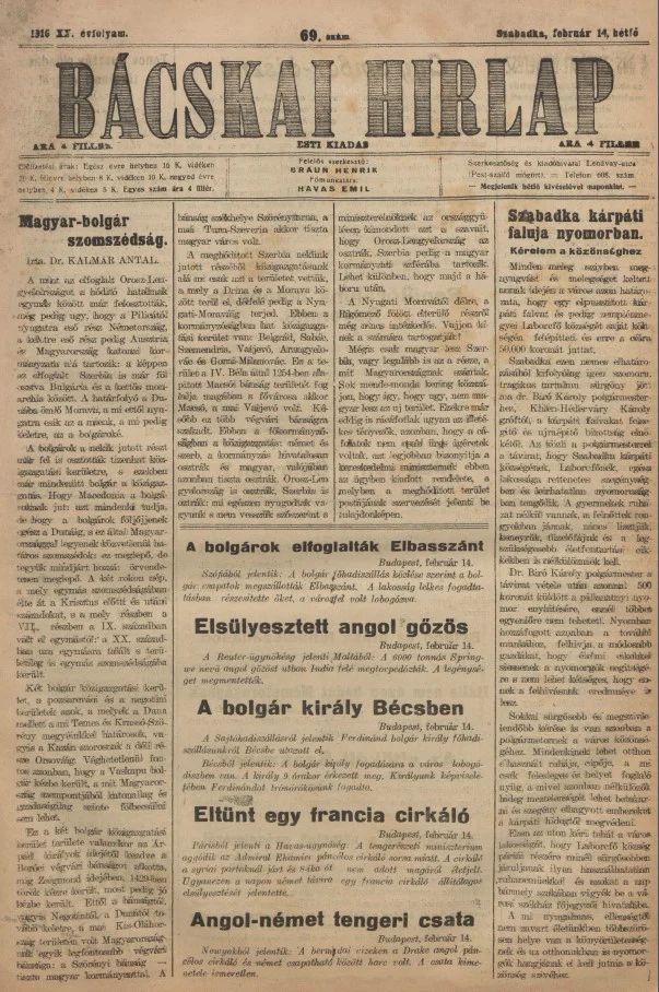 Bácskai Hirlap, 20. évf. 1916. február 14. 69. sz.