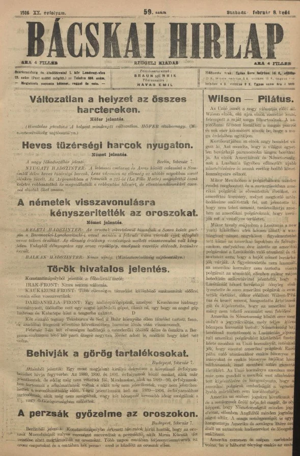 Bácskai Hirlap, 20. évf. 1916. február 8. 59. sz.