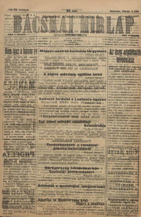 Bácskai Hirlap, 20. évf. 1916. február 8. 60. sz.