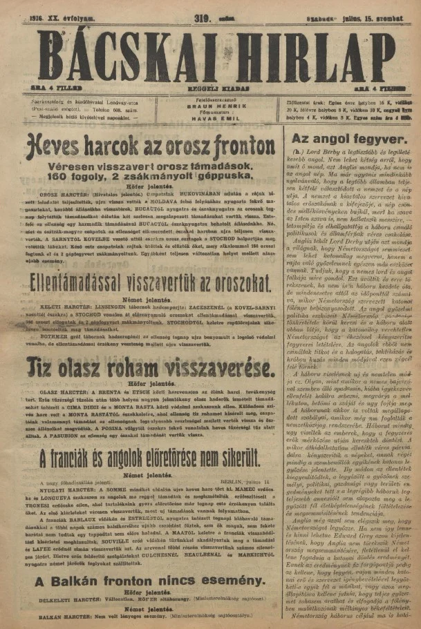 Bácskai Hirlap, 20. évf. 1916. július 15. 319. sz.