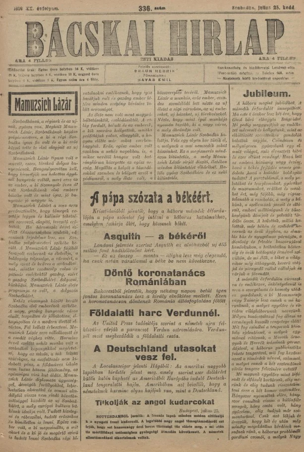 Bácskai Hirlap, 20. évf. 1916. július 25. 336. sz.