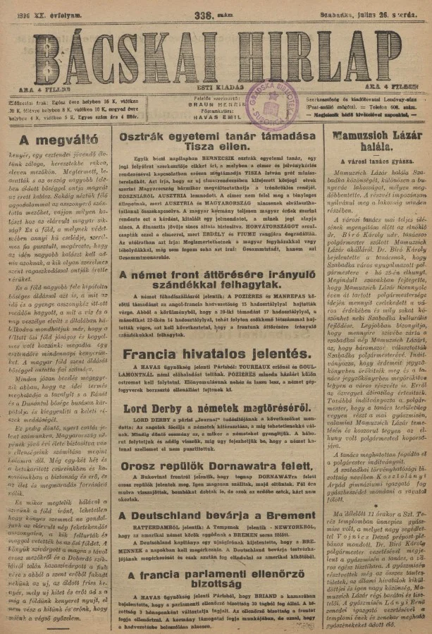 Bácskai Hirlap, 20. évf. 1916. július 26. 338. sz.