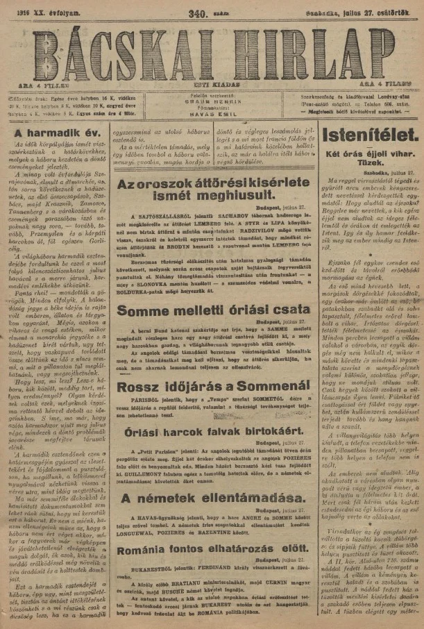 Bácskai Hirlap, 20. évf. 1916. július 27. 340. sz.