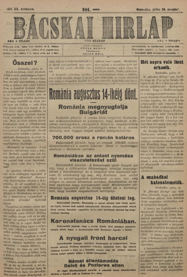 Bácskai Hirlap, 20. évf. 1916. július 29. 344. sz.
