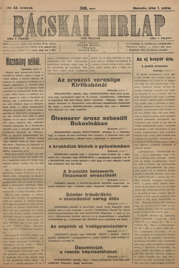 Bácskai Hirlap, 20. évf. 1916. július 7. 306. sz.