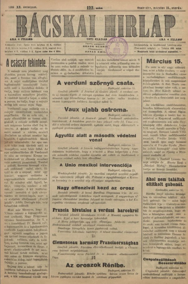 Bácskai Hirlap, 20. évf. 1916. március 15. 122. sz.