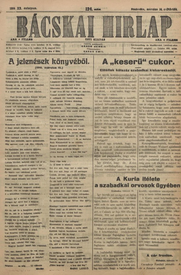 Bácskai Hirlap, 20. évf. 1916. március 16. 124. sz.