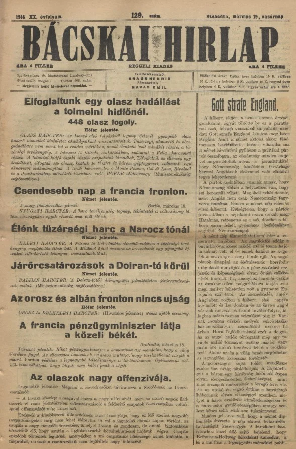 Bácskai Hirlap, 20. évf. 1916. március 19. 129. sz.