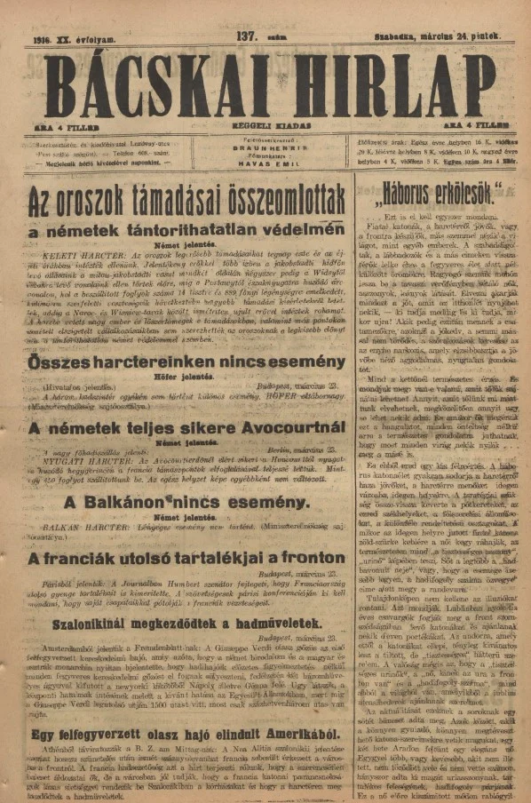 Bácskai Hirlap, 20. évf. 1916. március 24. 137. sz.