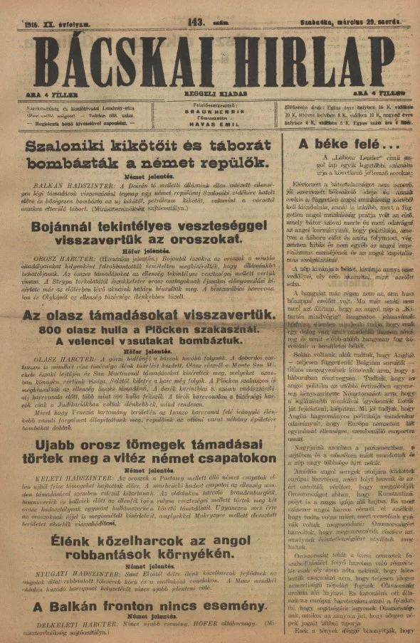 Bácskai Hirlap, 20. évf. 1916. március 29. 143. sz.