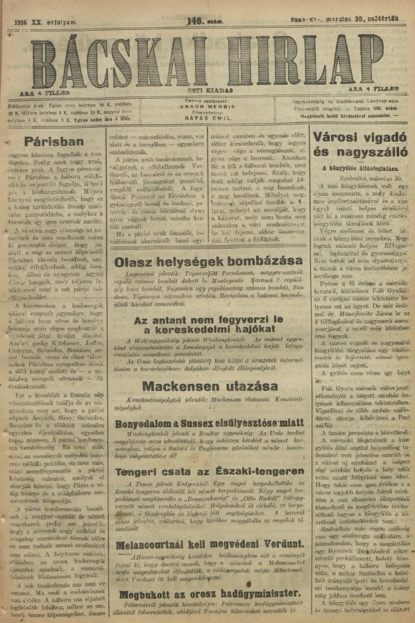 Bácskai Hirlap, 20. évf. 1916. március 30. 146. sz.