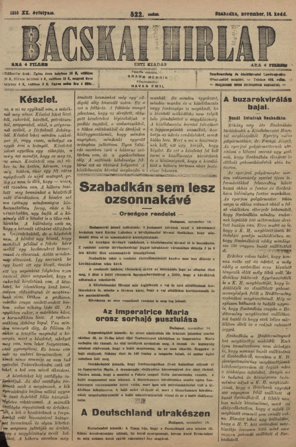 Bácskai Hirlap, 20. évf. 1916. november 14. 522. sz.