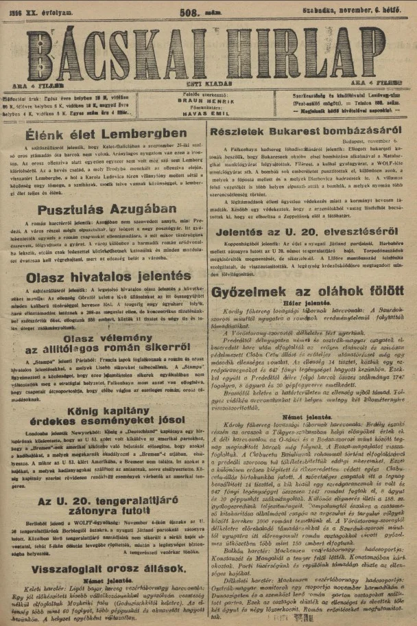Bácskai Hirlap, 20. évf. 1916. november 6. 508. sz.