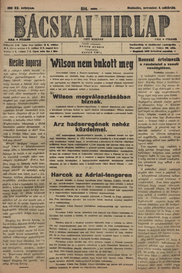 Bácskai Hirlap, 20. évf. 1916. november 9. 514. sz.