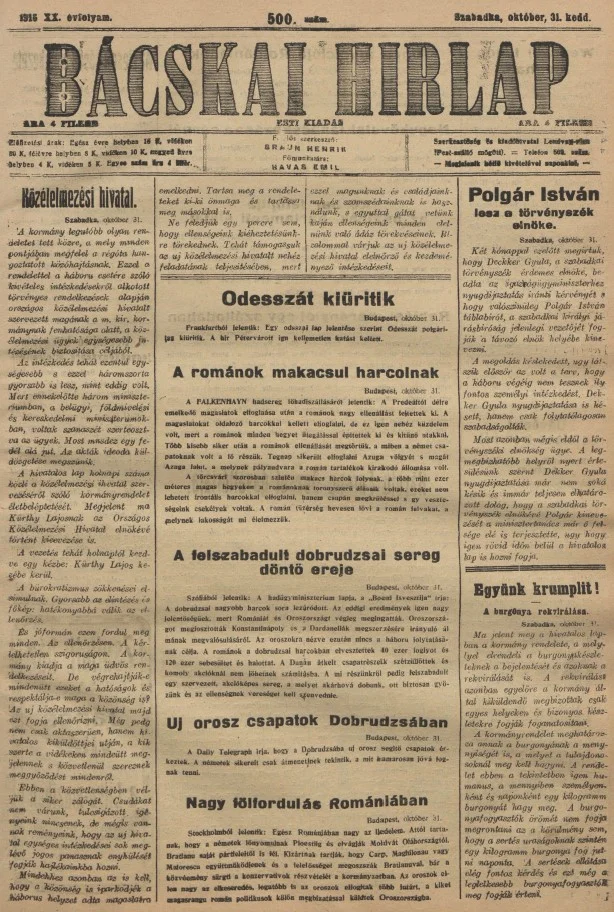 Bácskai Hirlap, 20. évf. 1916. október 31. 500. sz.