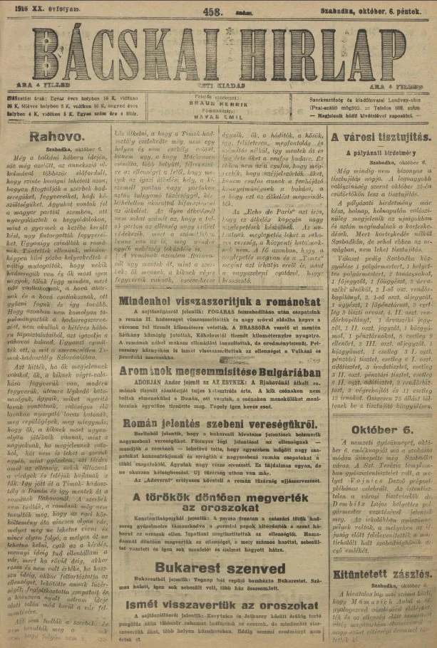 Bácskai Hirlap, 20. évf. 1916. október 6. 458. sz.