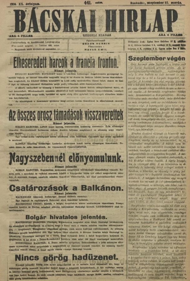 Bácskai Hirlap, 20. évf. 1916. szeptember 27. 441. sz.