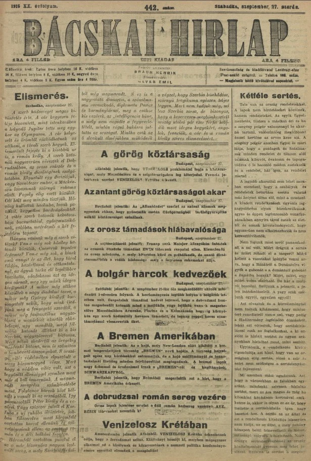Bácskai Hirlap, 20. évf. 1916. szeptember 27. 442. sz.