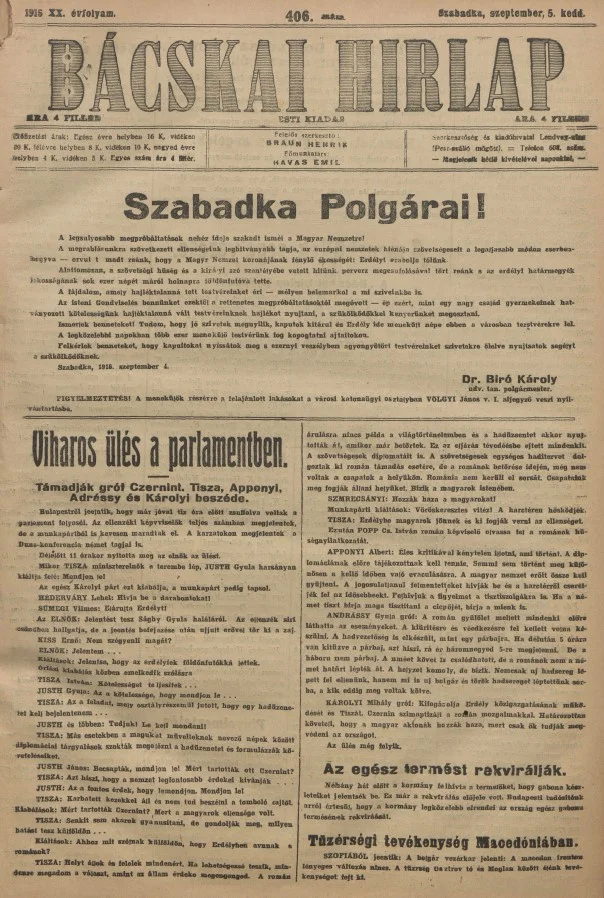 Bácskai Hirlap, 20. évf. 1916. szeptember 5. 406. sz.