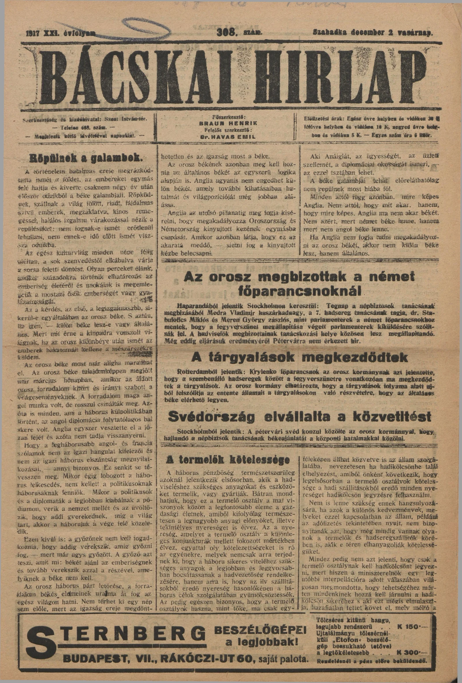 Bácskai Hirlap, 21. évf. 1917. december 2. 308. sz.