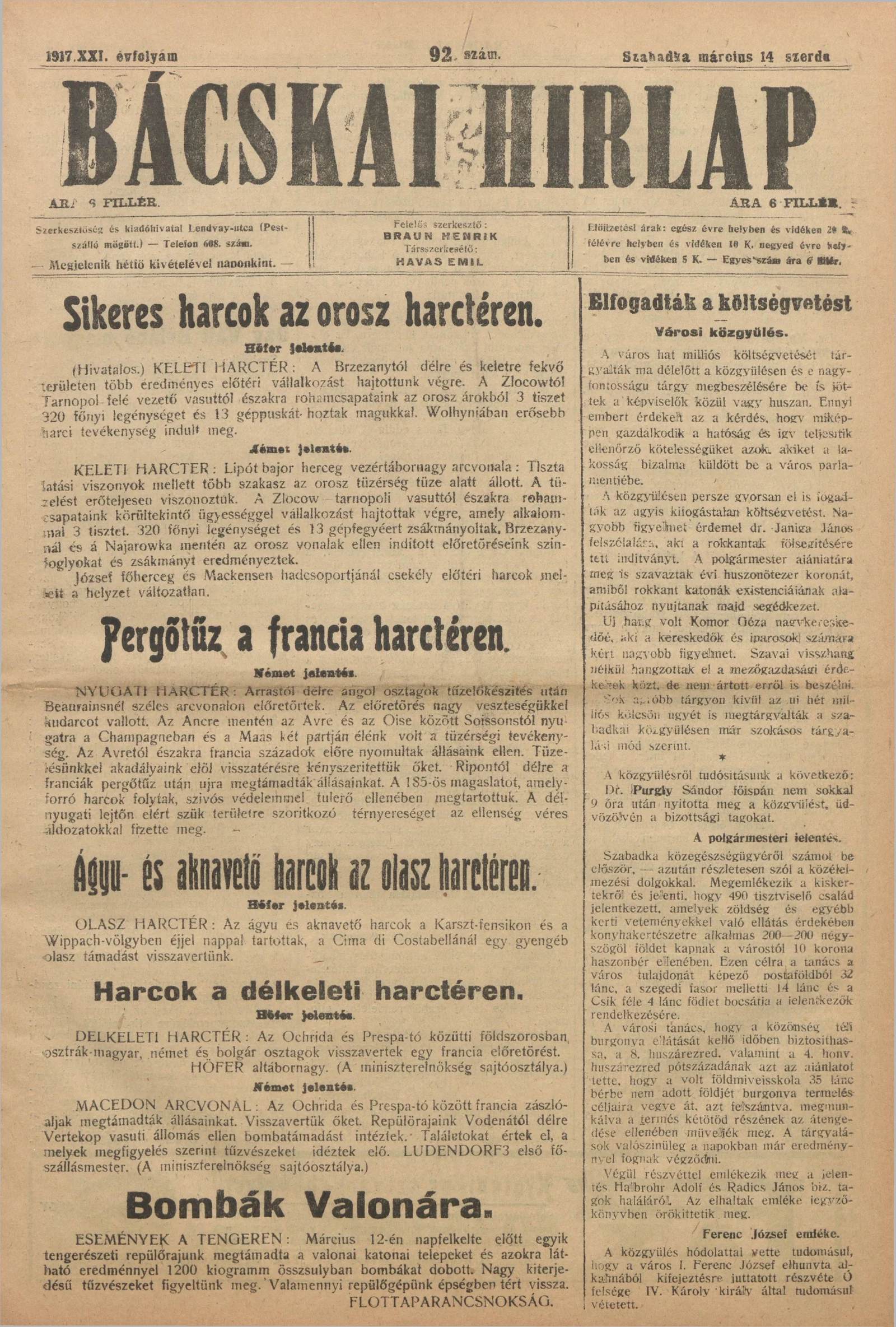 Bácskai Hirlap, 21. évf. 1917. március 14. 92. sz.