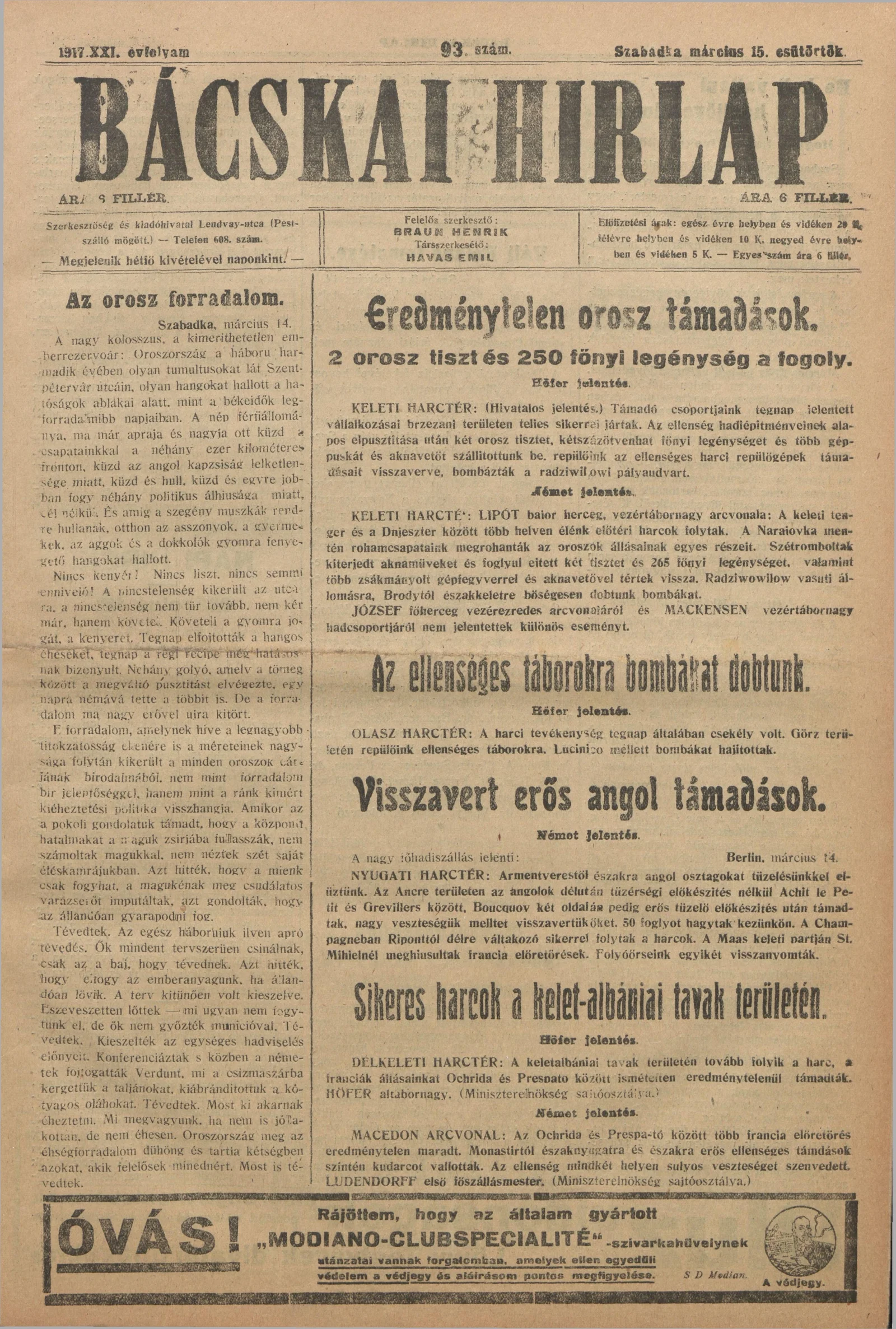 Bácskai Hirlap, 21. évf. 1917. március 15. 93. sz.