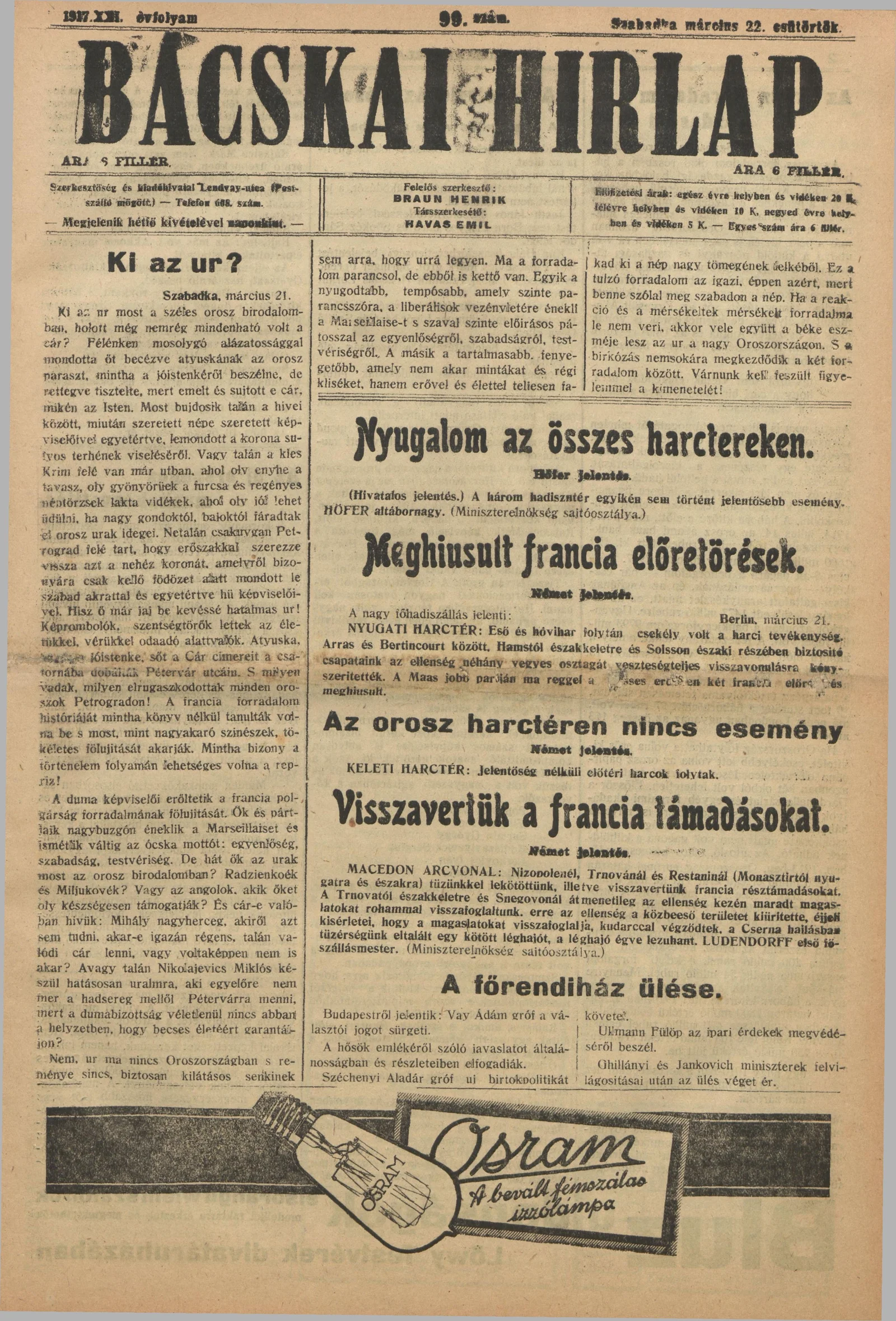 Bácskai Hirlap, 21. évf. 1917. március 22. 99. sz.