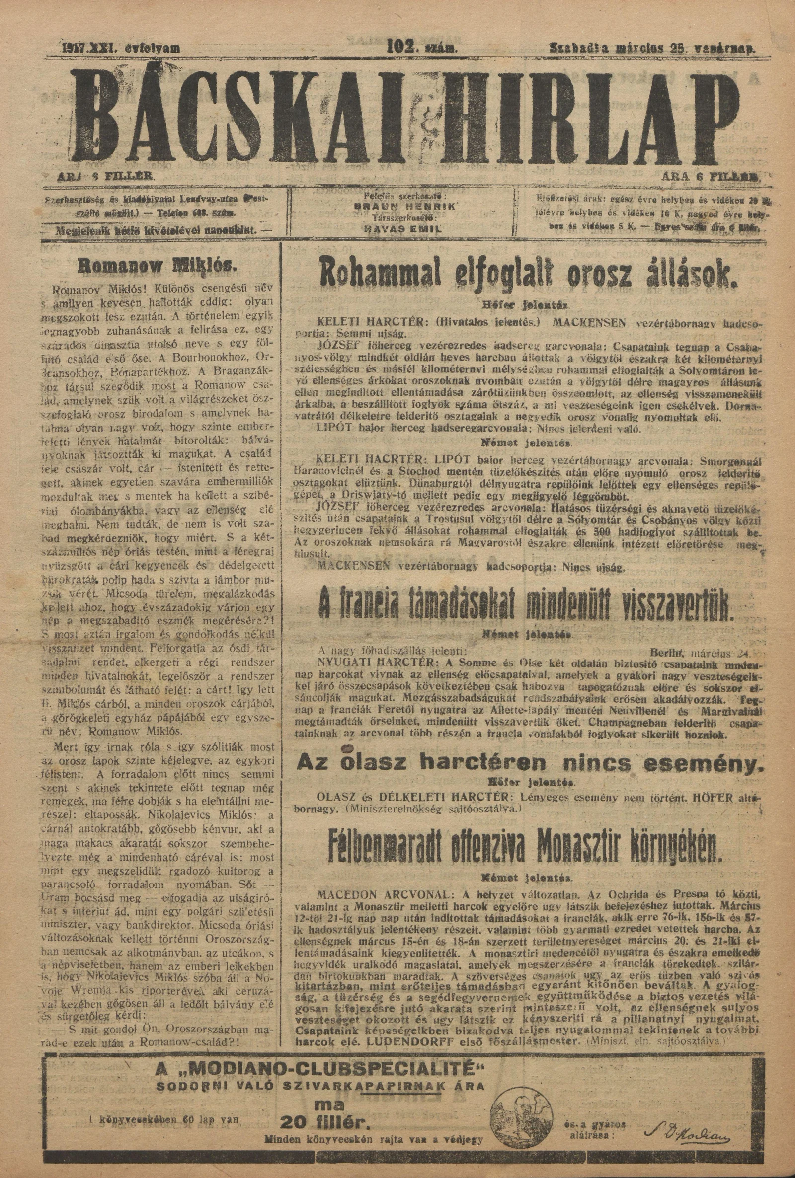 Bácskai Hirlap, 21. évf. 1917. március 25. 102. sz.