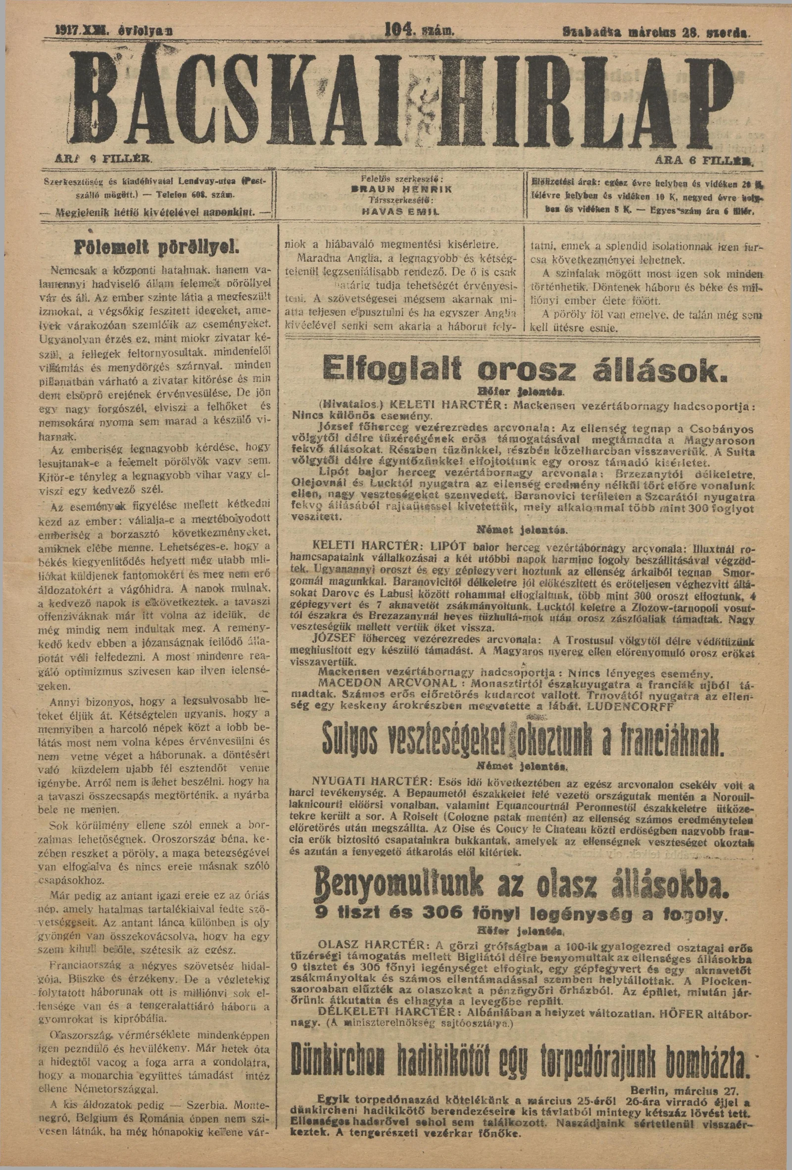 Bácskai Hirlap, 21. évf. 1917. március 28. 104. sz.