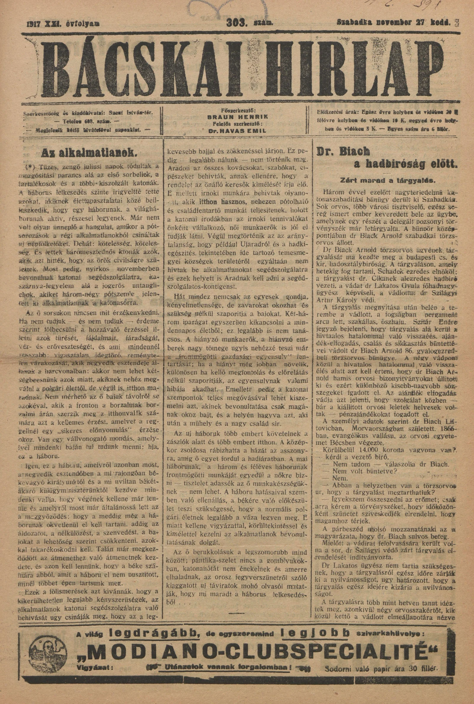 Bácskai Hirlap, 21. évf. 1917. november 27. 303. sz.