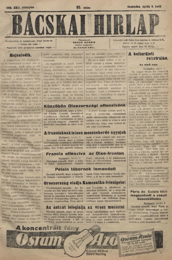 Bácskai Hirlap, 22. évf. 1918. április 9. 81. sz.