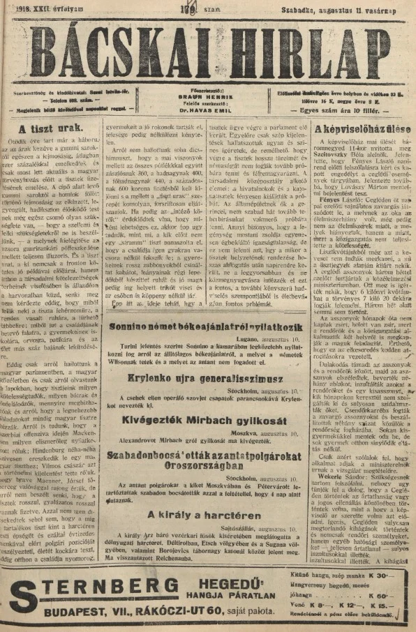 Bácskai Hirlap, 22. évf. 1918. augusztus 11. 180. sz.