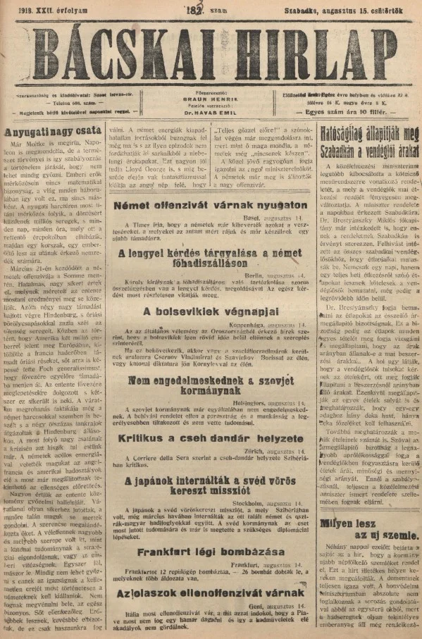 Bácskai Hirlap, 22. évf. 1918. augusztus 15. 183. sz.