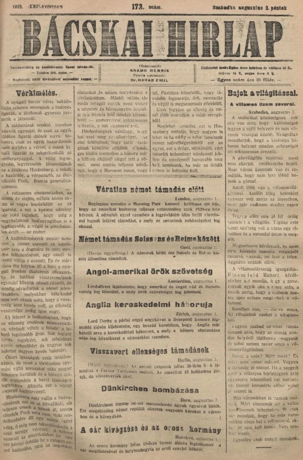 Bácskai Hirlap, 22. évf. 1918. augusztus 2. 172. sz.