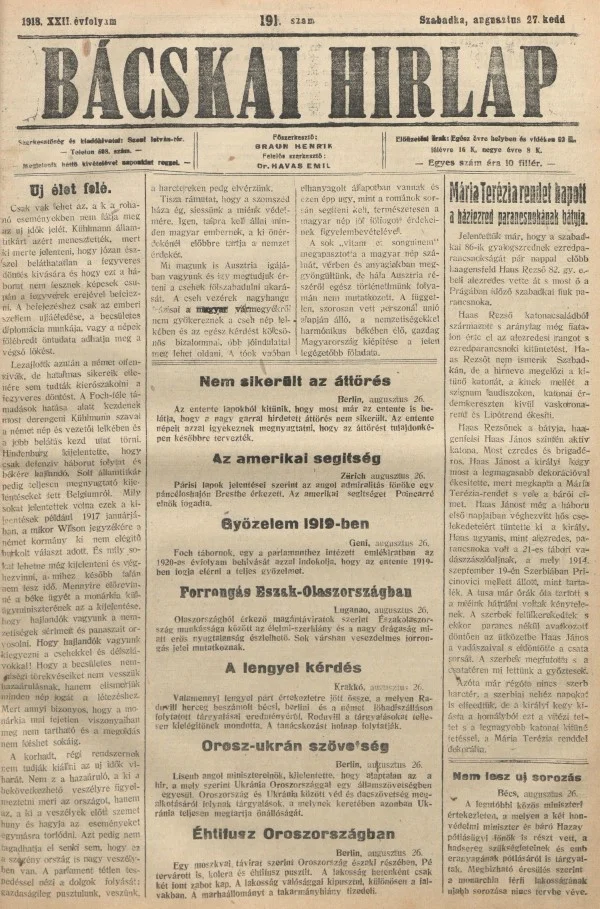 Bácskai Hirlap, 22. évf. 1918. augusztus 27. 191. sz.