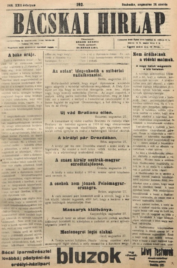 Bácskai Hirlap, 22. évf. 1918. augusztus 28. 192. sz.