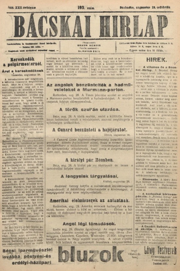 Bácskai Hirlap, 22. évf. 1918. augusztus 29. 193. sz.