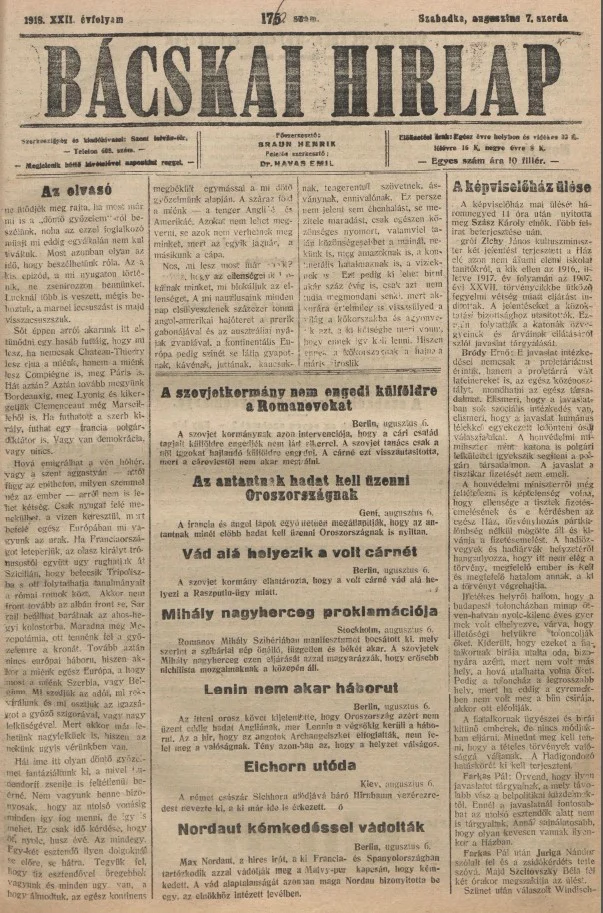Bácskai Hirlap, 22. évf. 1918. augusztus 7. 176. sz.